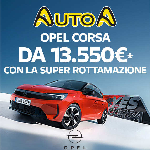 DETTAGLIO PROMOZIONE: Es. di finanziamento Scelta Opel su Corsa MY26 Edition 1.2 Benzina 100 cv, cambio manuale: Prezzo Listino (IVA e messa su strada incluse, IPT, kit sicurezza + contributo PFU e bollo su dichiarazione di conformità esclusi) 21.200 €. Prezzo Promo 14.450 € (oppure 13.450€ oltre oneri finanziari, solo con finanziamento Scelta Opel). Anticipo 2.905€ – Importo Totale del Credito 11.211€ L’offerta include il servizio Identicar 12 mesi di 271 €. Importo Totale Dovuto 14.198€ composto da: Importo Totale del Credito, spese di istruttoria 395€, Interessi 2.833€, spese di incasso mensili 3,5€, imposta sostitutiva sul contratto da addebitare sulla prima rata di 28,03€. Tale importo è da restituirsi in n°36 rate come segue: n°2 rate da 0€ e n° 33 rate da 99 € e una Rata Finale Residua (pari al Valore Garantito Futuro) 10.705,17€ incluse spese di incasso mensili di 3,5€. Spese invio rendiconto periodico cartaceo: 0€/anno. TAN (fisso) 7,99%, TAEG 11,36%. Solo in caso di restituzione e/o sostituzione del veicolo alla scadenza contrattualmente prevista, verrà addebitato un costo pari a 0,1€/km ove il veicolo abbia superato il chilometraggio massimo di 30.000 km. Offerta valida solo in caso di rottamazione fino ad euro 4 su clientela privata per vetture in stock con vincolo di immatricolazione entro il 31/03/2026 presso i Concessionari aderenti, non cumulabile con altre iniziative in corso.Offerta Stellantis Financial Services Italia S.p.A. soggetta ad approvazione. Documentazione precontrattuale bancaria/assicurativa in concessionaria e sul sito www.stellantis-financial-services.it (Sez. Trasparenza). Messaggio Pubblicitario con finalità promozionale.