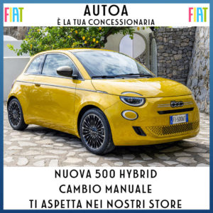 2.450€ SCONTO FIAT IN CASO DI ROTTAMAZIONE + 1500€ CON FINANZIAMENTO. Solo in caso di rottamazione di un veicolo omologato fino ad EURO 4. Fiat 500 Hybrid POP 1.0 65 CV Listino €19.900 (IPT e contributo PFU esclusi), promo €17.450 oppure €15.950 solo con finanziamento Stellantis Financial Services. Es. di finanziamento Stellantis Financial Services Italia S.p.a.: Anticipo 4.774 € – Importo Totale del Credito 11.446,78 €. L’offerta include il servizio Identicar 12 mesi di 271 €. Importo Totale Dovuto 15.060,1 € composto da: Importo Totale del Credito, spese di istruttoria 395 €, Interessi 3.062,72 €, spese di incasso mensili 3,5 €, imposta sostitutiva sul contratto da addebitare sulla prima rata di 29,6 €. Tale importo è da restituirsi in n° 36 rate come segue: n° 35 rate da 99 € e una Rata Finale Residua (pari al Valore Garantito Futuro) di 11.565,5 € incluse spese di incasso mensili di 3,5 €. Spese invio rendiconto periodico cartaceo: 0 € /anno. TAN (fisso) 8,75%, TAEG 12,09%. Solo in caso di restituzione e/o sostituzione del veicolo alla scadenza contrattualmente prevista, verrà addebitato un costo pari a 0,1 €/ km ove il veicolo abbia superato il chilometraggio massimo di 30.000 km. Offerta valida solo su clientela privata solo per contratti stipulati fino al 31 Gennaio 2026, non cumulabile con altre iniziative in corso. Offerta Stellantis Financial Services Italia S.p.A. soggetta ad approvazione. Documentazione precontrattuale bancaria/assicurativa in concessionaria e sul sito www.stellantis-financial-services.it (Sez. Trasparenza). Messaggio Pubblicitario con finalità promozionale. Immagini illustrative; caratteristiche/colori possono differire.